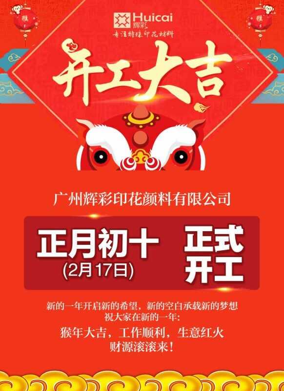 广州辉彩特殊印花材料于2016年02月17日(正月初十)为开工时间,在放假这段时间接到的订单,本公司今天会陆续发出,发出之后本公司会以短信的方式通知大家。请广大客户留意一下短信。在此期间给大家带来的不便之处,敬请谅解!广州辉彩特殊印花材料有限公司