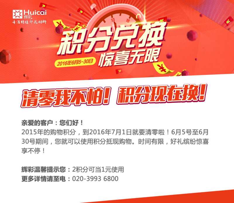 辉彩印花材料2016年积分兑换月活动火热开始,开始时间为06月05日至06月30日。