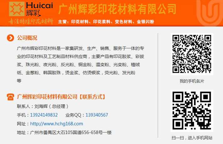广州辉彩印花颜料有限公司是一家拥有十多年夜光粉生产经验的夜光粉厂家,我们生产的夜光粉种类、颜色齐全,所有型号的夜光粉都可以在辉彩里买到。而且辉彩夜光粉有添加量小的特点,大大降低了使用成本,发光时间比普通型夜光粉多10倍以上,耐候性好,户内、户外都可使用。电话:13380087567