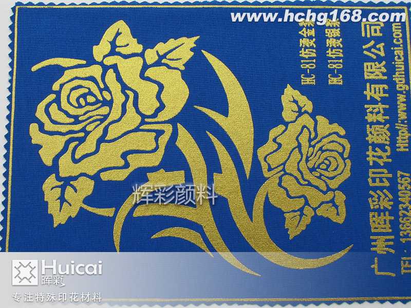 辉彩烫金浆和仿烫金浆印出来的图案都是金色的,烫金浆、仿烫金浆在印花效果上有很大的相同点,但是实际上两种浆料是不一样的。烫金印花工艺要先印烫金浆然后在热转印烫金,工艺会相对复杂,而仿烫金浆印花可以一次性成型,工艺相对简单。